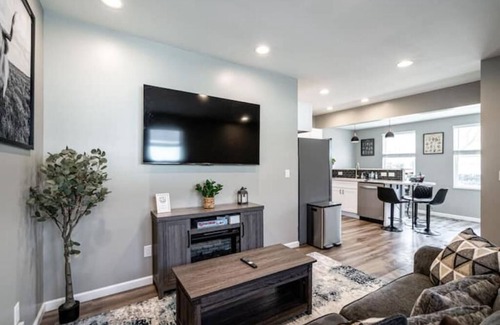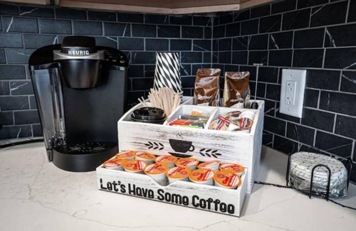 Enjoy the spacious and fully equipped cozy kitchen with a breakfast bar. Don't forget the full coffee bar for your morning cup of Joe! The comfortable living room has a full-size sleeper sofa, an electric fireplace, and a 65" Smart TV. Also, you will find a half bathroom for your comfort.