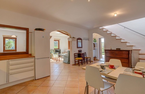 Over two gates and through a wonderfully natural landscape you reach the entrance to the house with a massive wooden door. The outdoor area is spacious. On the right you will find a romantic seat under an oak tree. Left hand and surrounded by a small forest and meadows the fully equipped terrace and the 8x4 m2 pool with skin-friendly salt water. By the pool there are 4 sun loungers and a parasol. The patio area has a dining table with seating for up to 6 people, a Weber barbecue for charcoal and a cozy sofa set. Through the massive wooden door you reach the entrance area of the house, on the right the dining area with a great wooden table, on the left the living room area with sofa and armchair. Straight ahead you get into the spacious fully equipped kitchen with an additional dining table for up to four people. The terrace can be entered from the living room as well as from the kitchen. From here it goes to the first floor, in which the two bedrooms (Bedroom1 bed with queen size bed 160x200 cm and Bedroom2 with 2 beds of 100x200 cm each) and the main bathroom with bathtub. A second bathroom with shower is located on the ground floor in the patio area at the house. La Coma has an air con in both bedrooms and a Wifi Internet access. This villa is a quaint nice and comfortable little country house, for people who love to spend time in nature.