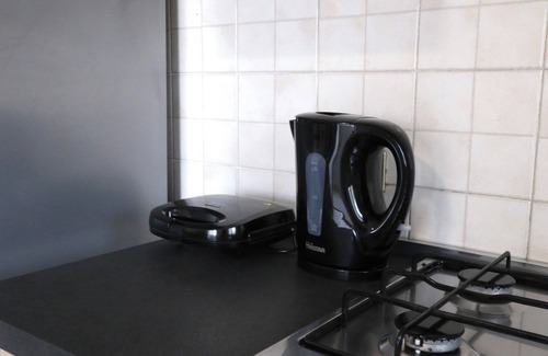 Fully Equipped Kitchenette: Kettle, cooking utensils, automatic coffee machine, oven, and large fridge.