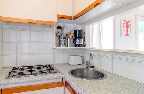You go down steps outside to get to the apartment which is all on one floor and has a terrace. Lounge-dining room with sofa-bed, armchairs, TV, wooden round table and chairs, with doors leading to the terrace. The kitchen is separated from this space and looks towards it through an opening in the wall. Small kitchen equipped with fridge-freezer, stove, microwave, coffee maker, toaster and tableware.