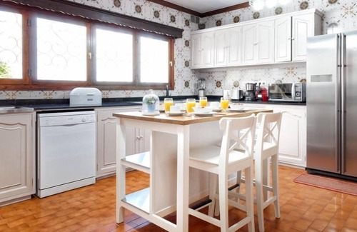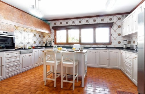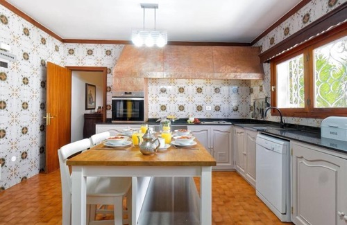"La Ideal", 6-room house 500 m2. Rustic and antique furnishings: living/dining room with dining table, digital TV and air conditioning. Exit to the patio. 1 room with 1 french bed and bath/WC. 2 rooms, each room with 1 french bed. 2 rooms, each room with 2 beds and air conditioning. Kitchen (oven, dishwasher, 3 ceramic glass hob hotplates, toaster, kettle, microwave, freezer, electric coffee machine) with dining table. 2 showers/WC, sep. WC. Balcony, patio. Terrace furniture, balcony furniture, barbecue, deck chairs. View of the swimming pool and the garden. Facilities: washing machine, dryer, safe, iron, children's high chair, baby cot for up to 2 year olds, hair dryer. Internet (WiFi, free). Parking. Please note: non-smoking house. Maximum 1 pet/ dog allowed. 2023-T4717 ESFCTU0000350070007679150000000000000VV-35-1-00195689