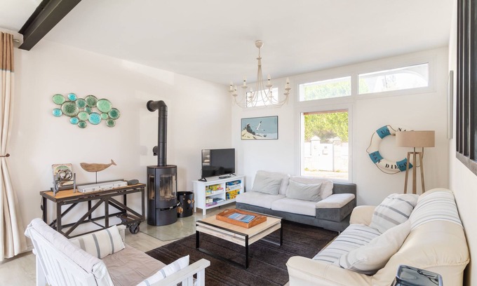 In Lancieux, we offer this charming 150 m² house for rent, with wifi, less than a 300 meters from the Saint-Sieu beach, which can accommodate up to 10 guests. It has a lovely 40 m² living room (with fireplace), a fully equipped kitchen, five bedrooms, three bathrooms (with shower and bath) and a garden of around 300 m². Cleaning is included in the rental price and 4-star hotel-quality linen is provided (sheets, towels, tea towels). Your bed will be made up on arrival.