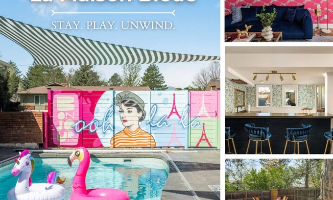 Discover La Maison Bleue: A stunning designer retreat that redefines group travel! This 1-of-a-kind escape combines bold aesthetics with high-end comfort to create the perfect backdrop for your next getaway. Featuring amenities such as a private pool, hot tub, gym, sauna, karaoke, and game room- this home is perfect for group gatherings. While it feels like a private paradise, you're a short drive from downtown and the mountains beyond. Explore the city by day and come home to luxury by night!