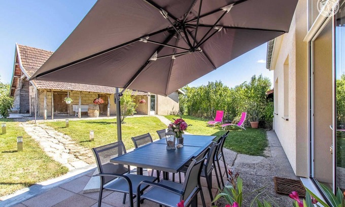 Farmers now retired, whose nearby farm you can visit which still welcomes many animals for the enjoyment of children (horses, donkeys, geese, chickens, ducks, rabbits, etc.), Évelyne & Michel welcome you in a old country farmhouse dating from the end of the 19th century, now fully restored & revamped into a comfortable contemporary holiday resort. Absolute calm, in the heart of a peaceful little residential hamlet nestled in the countryside 2.5 km from the center of the charming typical Bressan village of Simard. In the hollow of a relaxing rural & agricultural setting preserved on the immediate edge of vast fields, rivers & meadows, a stone's throw from a bucolic little private, intimate & wooded pond, protected from view by a small wood, with a sheltered room fitted out with summer kitchen, perfect little "spot" for any fishing enthusiast or for basking & lounging in a privileged natural setting. Restful green site & ultra rejuvenating. Spacious gîte with good comfort. Lovely contemporary country style with a "rustic chic" spirit. Warm, soft and exotic atmosphere of an old house. Spacious exposed & shaded terrace opening onto a pleasant enclosed garden furnished and flowered with care, with the historic outbuildings of the farm including a large sheltered passageway terrace (and a bicycle room) as well as a gravel courtyard (potential for pétanque natural!). Beautiful open view over the surrounding countryside. Composition: Village house adjoining another house (total independence without vis-à-vis). Wireless. Oil central heating. Single storey cottage: kitchen, living room, 2 bedrooms (double bed 140x190cm / 2 single beds 90x190cm), bathroom (shower + bath), separate WC (2 descending steps to access the sanitary area) . Enclosed land (250m²) + terrace + parking + sheltered terrace + bike room. All private. Shops and services 6.5 km. TGV stations: Creusot 61 km, Mâcon 74 km.