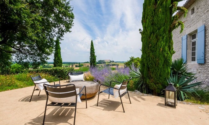 Outside, amongst fragrant lavender, rosemary and heather is a pool and a terrace where guests will be hypnotized by the views across the countryside and to the recently restored Château de Theobon, in the distance.