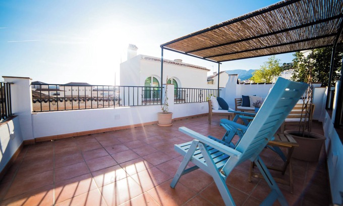 La Montsiña has capacity for 5 people (4 adults maximum). It has 3 bedrooms and 2 bathrooms (a double room with an en-suite bathroom, a double room with two single beds and a room with a single bed). It has a kitchen open to the living room, from which you can access a small terrace. In the upper part, you can enjoy a pleasant second 360º panoramic terrace with excellent views of the town and the mountains, from which you can see La Maroma, the highest peak in Malaga.