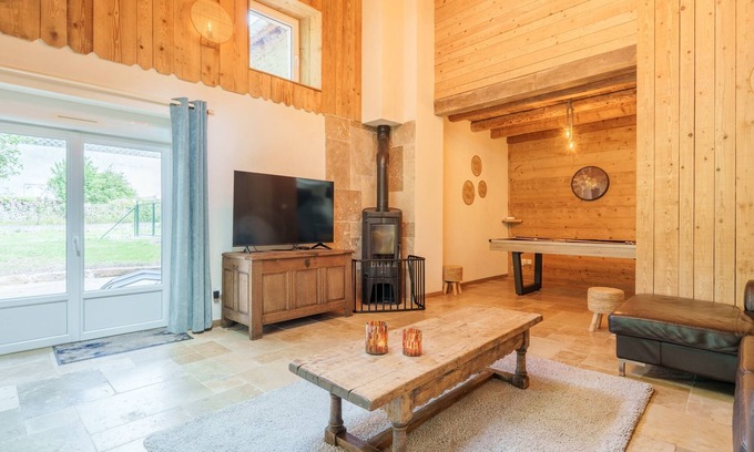 - A 100 m² living room with TV, fireplace (wood not provided), sofa, pool table that converts into a ping pong table, and dining area