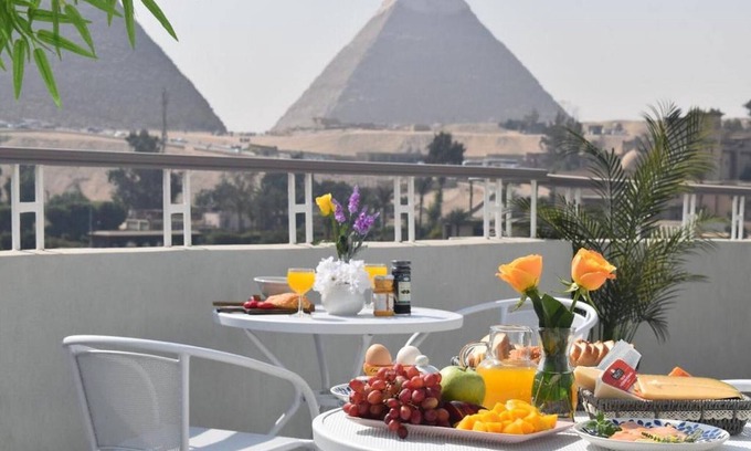 A unique, furnished and fully air-conditioned one-bedroom flat, with a sunny, spacious open-plan living-room design and a fully equipped kitchen from utensils to the coffee machine. Thanks to the 40sqm Terrace, you will have 180 degrees view over the great Giza pyramids whilst having a drink or indulging in a delicious meal with a million dollars view. The Terrace is prepared with sun shields, a sofa and two tables and relaxing chairs to insure your relaxation day and night. The bedroom is furnished with luxurious beddings including bedsheets, duvet covers, pillows and towels too, which are all made 100% from the famous premium Egyptian cotton. You will find a bathtub, toilet and sink packed with high-end, natural toiletries in the bathroom. The living room is an open-plan design, with a breathtaking view over the terrace, hence the pyramids too. Within walking distance, you will be at the Pyramids, the new National Egyptian Museum, local shops and restaurants and minutes away from the historic Marriott Mena House.