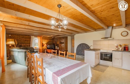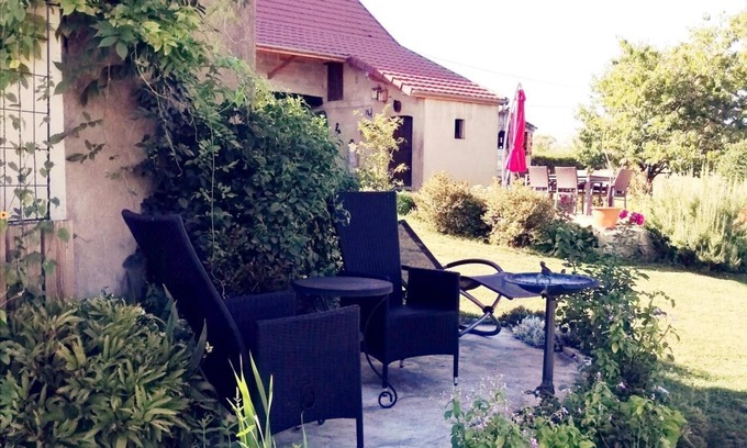 Lina opens the doors of an authentic traditional Bresse farm (having preserved its old facade), nestled in a "belvedere" on a mini hill overlooking a vast field of crops on the edge of a small forest bordered by a bucolic river full of fish. Total tranquility, nestled in a small rural hamlet scattered in the heart of the Bresse countryside, in the hollow of a soothing preserved setting of nature & greenery (protected in ZNIEFF for its fauna & flora riches), a stone's throw from a vast wild forest dotted with large ponds (protected in "Natura 2000 Zone" for their exceptional biotopes, particularly ornithological, because they are home to very rare species). 100% soothing setting. Literally a haven of peace & rest. Possibility of observing wildlife (deer, hares, foxes, pheasants, etc.). Comfortable gîte. Large living room where an authentic & masterful medieval cast iron fireplace plate with "coat of arms" sits enthroned. Warm character mixing country atmosphere with contemporary touches & wooded mountain spirit. Cozy & cozy. Beautiful flowery & very neat property of 1500m² (grassed, wooded & planted) with a beautiful panoramic terrace, a small pond, a "mini" aromatic garden (available to guests) as well as various small spaces designed for relaxation & rest. Beautiful unobstructed view of the surrounding countryside & the Jura mountain range in the background. Composition: Detached house next to the owner's house (total independence). Electric heating. Wifi (fiber). Washing machine + dryer in shared laundry room (outside). Ground floor: living room-kitchen-lounge, 2 bedrooms (double bed 180x200cm + single bed 90x190cm / double bed 160x200cm), one with independent access possible from the outside (internal access "in a row" via another bedroom & shower room), shower room (shower/WC). Sheltered corridor + terrace + private parking. Garden (1500m²) shared with owner. Bicycle storage. Shops 12 km. Supermarket 10 km.
