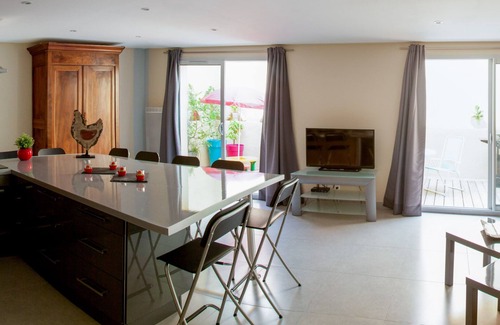 It is thus that "Remise" was born in 2014 (after 5 years of work). This is an apartment of about 90m2 consisting of a large living room (about 50m2) with fully equipped kitchen overlooking a roof terrace of 20m2, without any vis-à-vis. Terrace equipped with tables & chairs for 8 people, a parasol, a plancha and ....... a pretty green area (+ 1 WC on this first level)