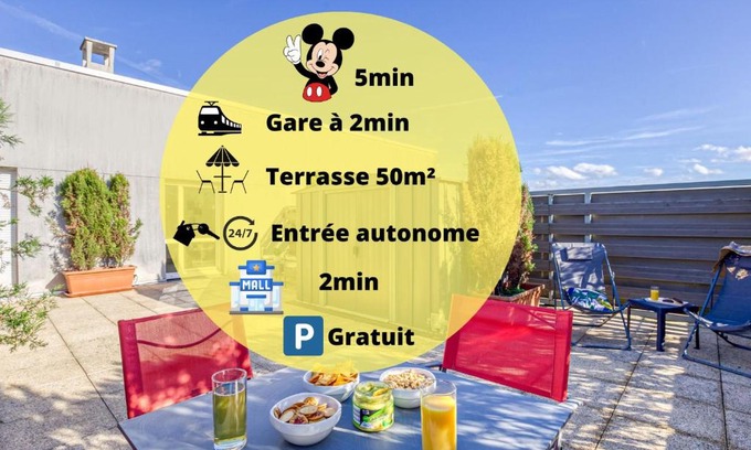 La terrasse Disney/Gare/Centre à 3min parking free is located in Montévrain.