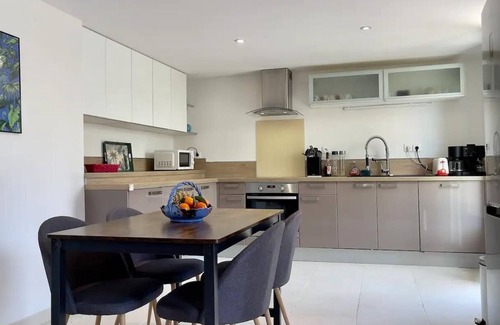 Duplex gîte with independent access via a slight slope and a few stairs. Ground floor : Entrance via private terrace to dining area and equipped kitchen. Lounge area with sofa bed for 2 people (140*x190) (access via a few steps). 1st level : Open bedroom on the mezzanine with 2 single beds that can be combined to form a large double bed of (160x200). Shower room with toilet Electric heating/air conditioning. Charges included. Baby cot and high chair available on request. End of stay cleaning, extra bed linen and toiletries on request. Private parking in enclosed property. Shared: Swimming pool (10.5m x 4.5m open all year round but NOT heated), pétanque court, ping-pong table Esprit Loft stay on the hills of the Nice region. The large bay windows offer direct immersion into this beautiful terraced property surrounded by oaks, chestnut trees and olive trees. The common swimming pool, open all year round, is shared between the 4 Gîtes in this area. The Gîte "Tulipe" is located on the ground floor of one of the villas (Gîte n°6301 La Rose). 20 minutes from Nice, Bendejun offers the authenticity and charm of small villages typical of the South. Perched on the heights of the Paillon valley between Contes and Coaraze, numerous paths will delight hikers and mountain bikers.