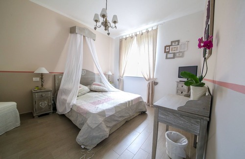 B&B la vecchia Tenenza is located in an apartment inside a recently renovated historic building in the heart of Città della Pieve. It overlooks the ancient medieval fortress and has a private bathroom with shower complete with hairdryer, towels and complimentary toiletries. The furnishings, with attention to every detail in the shabby chic style, the porcelain stoneware floor and the colored walls give the room a warm and welcoming atmosphere. The room has a TV and free Wi-Fi. The breakfast buffet takes place in the common area. Room cleaning is performed daily.