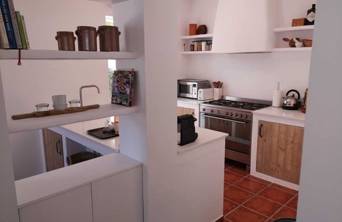 - open kitchen with gas hob, electric oven, microwave, dishwasher, refrigerator-freezer, coffee machine, electric kettle, toaster and juicer