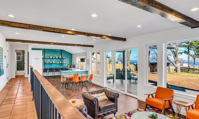 Meet for meals and hangouts in the open-concept common area, which includes a fully equipped and stocked kitchen, a mid-century modern dining table for 6, a living area with a large flatscreen TV, and a sweeping view of Lake Tawakoni front-and-center through a wall of windows.