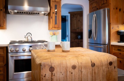 The full kitchen attaches to the dining room, with seating for six, and opens up to the cozy living room with a wraparound sectional couch and gas fireplace. The garage has been converted to an additional living space with ping pong table and TV, and includes the laundry area and an extra refrigerator.