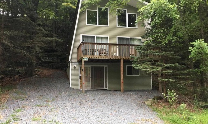 4 season Chalet exclusive Hideout gated community in Lake Ariel. Secure, safe with deep Cleaning between Guests. Free WiFi and parking with room to stretch. Tennis, basketball courts, ski lift, restaurant and lake access. Lovely Comfortable home set up for large group of Family & Friends. Fully equipped Kitchen, Dining & Living Room. Smart TVs in all bedrooms. Perfect Location to experience the lake regions of the Poconos! Swing bench, mountain and tranquil views, BBQ Grill on lovely patio deck.