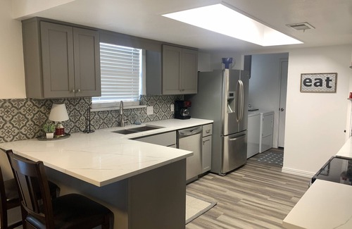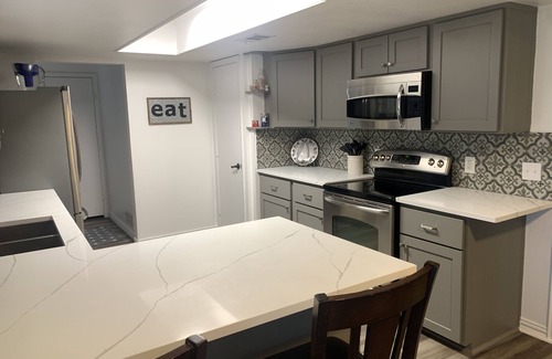 Newly updated waterfront home on Lake Bonham, an hour north of the DFW metroplex. New vinyl plank flooring, updated kitchen & new walk-in showers in both bathrooms. 3 Bedroom, 2 Bath - Master bedroom with king size bed, second bedroom has 2 twin bunks and third bedroom has queen size bed. Large living room, dining area and spacious kitchen with plenty of room for meal prep. Backyard has covered and uncovered patio/deck space. Covered deck has seating for 6 in club chairs. Uncovered decking is perfect place to cook and has bar seating for 4 overlooking lake. Backyard has fire pit, lighting and 2 person wooden swing. Large dock has covered and uncovered space for enjoying the sun and fishing and swimming. Beautiful sunsets!