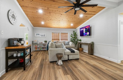 Outside, the host provides basic fishing poles and gear, life jacks, innertubes, two kayaks, a ping-pong table, firepit, 6 burner gas grill & charcoal BBQ pits, lounge chairs, and outdoor seating for your enjoyment. The boat dock is perfect to pull up your boat or water craft for direct access to Lake Conroe.