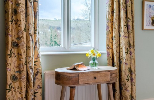 The cottages pretty, twin bedroom is furnished with two beds sharing a bedside chest of drawer and reading lamp and a large chest of drawers. Enjoy a view through the painted, stone mullion windows over the cottage’s rear garden and the neighbouring Old Priory’s garden.