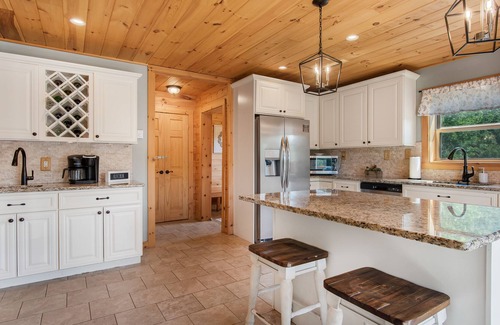 The home has a very large kitchen with granite countertops and stainless steel appliances. It also features a wet bar and large island for you and your guests.