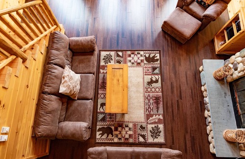 The main living area features a large floor to ceiling Stone wood burning fireplace, with couches to enjoy the view and the fire. It also attaches to the dining area which seats 8. The view is simply amazing with floor to ceiling windows in the great room!