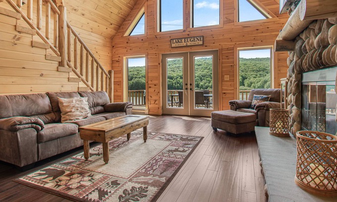 Lake Eugene Log Estate is the newest lakefront log home in the Catskills Cabin Fleet! This home features 5 Large Bedrooms and 2.5 Bathrooms and is approximately 3800 Sq Ft. You have a view of the lake from every room in this house! The home features a large 550 Sq ft deck on the front of the home with the most incredible views of the lake! This home is located only about 30-40 minutes from the All Star Village. This is the ultimate getaway for any family or couple, as it defines Luxury in the Catskills! The home has wireless internet as well as Directv.