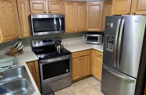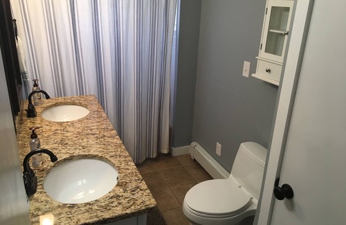 Each bedroom has a queen sized bed. There is also a sleeping loft that includes 1 full bed and 2 twin beds. Kitchen is stocked with essential cookware, utensils, microwave oven, dishwasher, electric stove/oven, refrigerator, coffee maker and toaster oven. The cozy living room includes, a fireplace, cable TV and DVD Player and an assortment of board games. Wifi connection is included as well. 1 bathroom with the added bonus of double sinks. Washer and dryer are located in the basement. There is a large deck with a grill that overlooks the lake. A private dock makes this location perfect for boats and jet skis in the warmer months. Easy access to lake and dock from house.