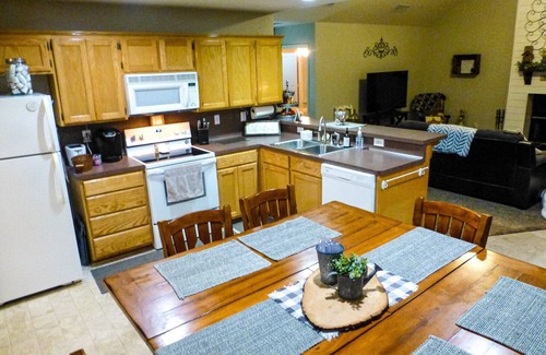 The open concept kitchen/dining/living area is great for preparing meals and visiting with your guests. The fully appointed kitchen includes a full-size refrigerator, electric range, microwave, and dishwasher as well as plenty of dishes, pans, and cooking utensils. The coffee station includes a drip coffee maker as well as a Keurig machine plus enough k-cups, sweeteners & creamers to get your vacation off to the right start.