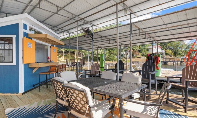 On the lower level, you’ll find a cozy den designed for fun and relaxation. Challenge friends to a round of Golden Tee or Pac-Man, sink into the wraparound couch and chairs for a movie night, or whip up a quick snack in the convenient kitchenette. When it’s time to head outdoors, the patio invites you with a dining table for alfresco meals, a grill, a bubbling hot tub, and plenty of seating for soaking up lake life. Your private dock is the ultimate hangout, complete with a dining table, seating, and a bar for lakeside entertaining. Take advantage of included kayaks, a water trampoline, and a floating water mat for endless hours of fun right on the water.