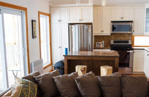 Patio doors in the living room open to the large elevated deck where you can find the best views of Lac Labelle, as well as a BBQ that is ready to use year round. Nestled underneath the patio, next to a door that is accessible by a downstairs bedroom, you will find the private spa and open back yard. During the summer you can sit around the fire-pit or enjoy the private dock that goes directly into the Lake. During the winter there are snowmobile trails all around and a beautiful frozen lake to explore. What could be better?