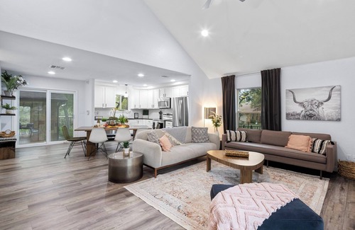 Escape to this lakefront retreat with two stunning homes side by side on a quiet cove of Lake LBJ. Enjoy private docks, large patios, swimming pool, hot tub, play ground and sandbox area for kids and spacious living areas. The half-acre yard shaded by huge pecan trees offers great outdoor play areas and relaxation. Perfect for families or groups, sleeping up to 25 guests, for unforgettable lake days and peaceful evenings.