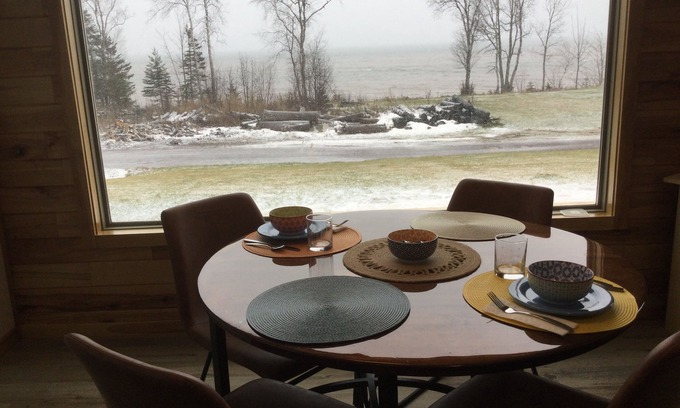 Dockside Resort vacation homes are the best of rustic luxury. “The Captain” wall-sized windows showcase awesome Lake Superior views, a modern kitchen, fab sinks, cool lighting. Hang out at the marina. One-of-a-kind!