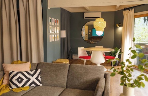 As you step into the chalet, you’ll be greeted by our cozy first-floor lounge with an Article couch and armchair, vintage Nintendo games, a record player, a 65" Smart TV, and a tulip-shaped table for cards, snacks, puzzles, or family game night. Escape from reality and enjoy our lounge for moments of entertainment or quiet reflection.