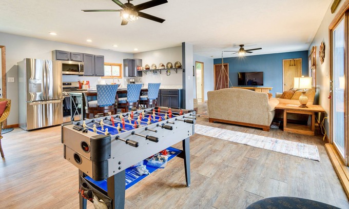 INDOOR LIVING: Smart TV, foosball table, dartboard, booth dining table, wood-burning stove, board games, books, ceiling fans