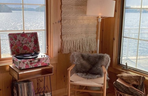 This super private island cabin is perfect for a couple or family of 4 looking for a secluded get away. *FYI boat access only: renters are required to have access to a boat, and a boat does not come with the rental. The cabin has a queen sized bed and is open concept with 2 open lofts with 2 double beds on each side (for a total of 4 double beds). The main room has a sitting area and a small basic kitchen (cooktop, countertop oven, fridge, sink and microwave), and a 3 piece bathroom. The cabin is equipped with WIFi , Sonos heat and air conditioning, as well as Smart TV with cable. Outside the flagstone deck has a dining set with umbrella, muskoka chairs, a BBQ and a firepit. The one slip boathouse is steps away and has a washer/dryer and an additional fridge/freezer. There are 2 kayaks and 2 SUPs included in the rental. Because this is an island property, renters are required to rent their own boats.