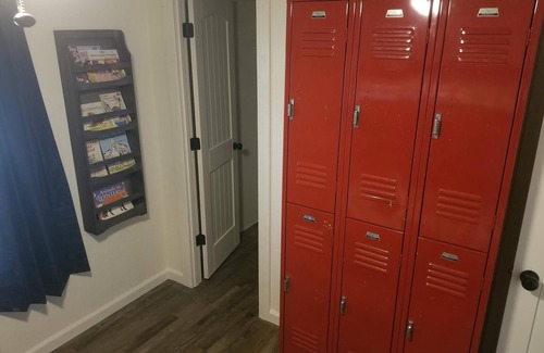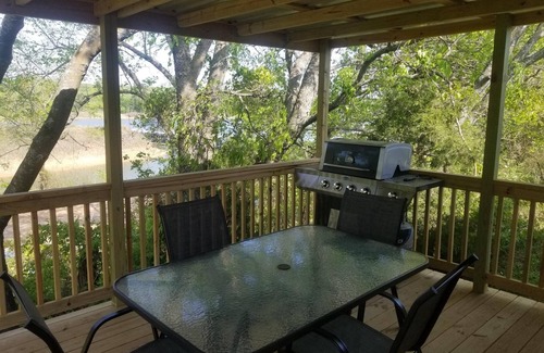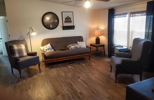 Spend your days boating, fishing, swimming, or soaking up the sunshine before coming back to the rustic charm of your farmhouse-inspired retreat. Unwind with family and friends in the relaxed living room area with plenty of space to stretch out or enjoy a few drinks. After a long day swimming or boating on the lake, sink into the comfortable full-size pull-out futon to enjoy a movie or your favorite shows on the flat-screen TV.