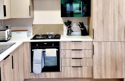 Kitchen - electric oven with gas hob, microwave, dishwasher, kettle and toaster.
