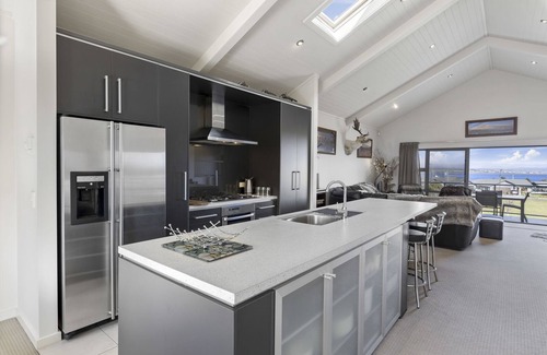 Decorated with sophisticated yet homely furnishings, the living area here at Bay Bliss feels wonderfully spacious thanks to its open-plan design and vaulted ceilings with exposed beams. Huge sliding glass doors on either side of the space provide fantastic indoor-outdoor flow, while a skylight above the kitchen lets in a tonne of natural light.