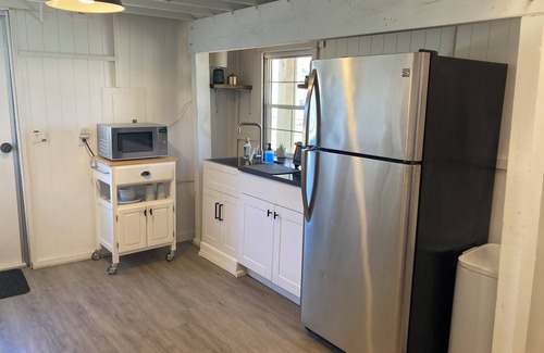 Fridge and freezer, microwave, toaster oven, electric skillet, coffee/tea bar, one burner hot plate, silverware, cutlery, plates and cups, pots and pans, wine glasses.