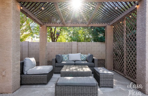 Sit on the back patio and watch the sunsets over the adjacent lake, and soak up the sunshine in this lovely Phoenix east valley home. This home-away-from-home is in the Superstition Springs area of Mesa, and is fully appointed and professionally designed for your comfort and enjoyment. Walk to the nearby movie theatre, or try out the many restaurants and shops nearby.