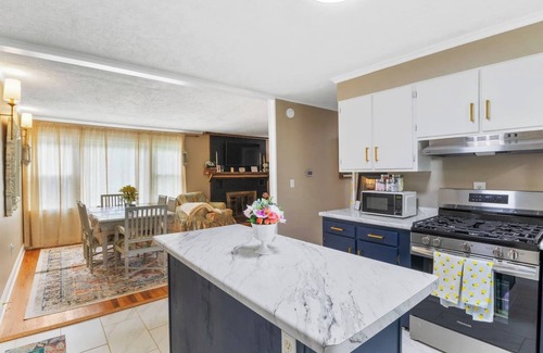 ✨Kitchen✨ - Step into this fully equipped kitchen featuring sleek stainless steel appliances, including a high-end gas stove and a spacious refrigerator, perfect for preparing gourmet meals. The beautiful countertops and stylish navy blue cabinetry complement the modern design, while the elegant tile flooring adds a touch of sophistication. This kitchen is ideal for cooking enthusiasts and guests who appreciate a well-appointed culinary space, making your stay at our Cayuga Lake house in Seneca Falls both comfortable and enjoyable. 🍽️👨🍳✨