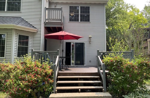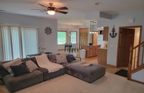 Welcome to our stunning lake house rental where tranquility meets family fun. Nestled on the shore of Duck Lake, this spacious retreat offers everything you need for an unforgettable vacation. With 1 King bedroom and couch to sleep 2 and two air mattress,1bathroom, it comfortably accommodates families friends seeking a relaxing getaway. First floor available only. It says sleeps 7 could potentially sleep 9 . Master Bedroom has King size bed sleeps 2 sectional couch sleeps 2 and 2 air mattress 1 queen and 1 twin. Also upon request we can put second king size bed and frame inside master bedroom for a extra 250$.