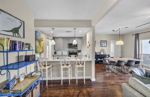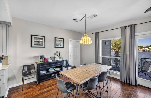 ^^Second floor^^: Living Room, Kitchen, Laundry, Dining Room and 1/2 bath. Wall of windows with amazing views of the lake and the marina. Covered balcony with al fresco dining, and loungers. The living room sofa is a queen sleeper with a memory foam mattress. It is perfect for overflow sleeping or snuggling up for movie watching. We don’t include it in our bed count. While we have a Smart TV, we also have tons of board games and puzzles and plenty of books. Great for ditching screen time and reconnecting!
