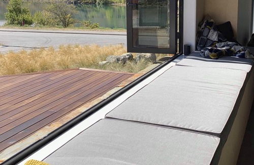 The 5-meter long bench seat has bifold windows that open onto the deck and soaks up the views of the lake and mountains.