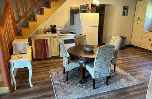 The handicap accessible cabin features an open floor plan, with a full kitchen and bathroom, spacious living room, and more. The first floor offers a bunk room with bunk beds (sleeps two), master bedroom (sleeps two), kitchen, full bath, dining area, and living room - which has a couch with a pullout bed (sleeps two). A loft provides sleeping accommodations for two. Other features include a covered porch overlooking the water, a fire pit to enjoy a campfire and s'mores, a boat launch that provides the opportunity to BYOB (Bring Your Own Boat & beer, of course), a dock to fish from, and a spacious yard to play yard games and enjoy the outdoors. Kayaks, paddle boards, an aluminum boat with a trolling motor, and life vests are also included. Other amenities include a gas grill and picnic table.