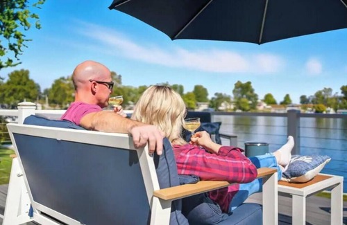 • The interior blends relaxed lake-chic with inviting decor — perfect for families, couples, or small groups