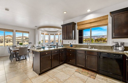 Our lakefront infinity pool and spa is sure to be your favorite spot and the focal point for any photo ops. Enjoy total relaxation in the sun (or shade) on the chaise lounge chairs or cabana-style patio bed while you enjoy the picturesque views of the lake and mountains. Entertaining poolside is a breeze with a grill, a bar, and a shaded dining area. Fire up the grill, make cocktails and settle in as you and your guests gather to take in the sunset while the kids splash around in the pool. Later, move the festivities to the lakeside fire pit and roast marshmallows underneath the stars or spend some time on the putting green! Mountain views, incredible sunsets, and the lake right at your back door, make this property your dream getaway. With scenery this lush, you'll forget you are actually in the desert!