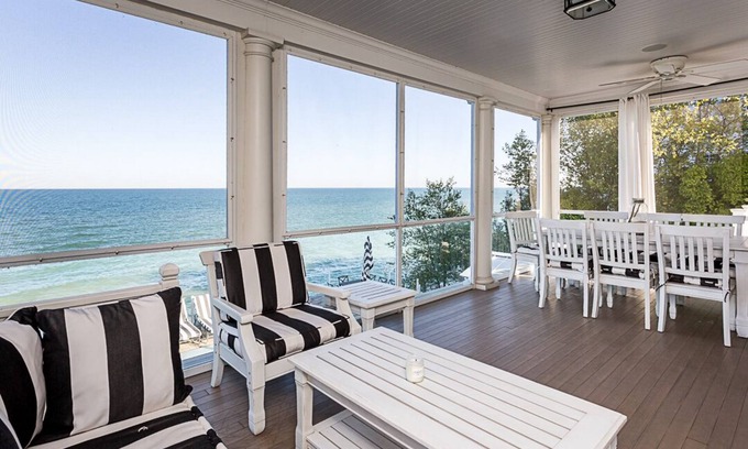Welcome to Elodie Cottage! This stunning European inspired lakefront home is located in the idyllic village of Grand Beach. With 4 bedrooms, a third floor bunk room that your kids will be talking about for years to come, and 5 1/2 bathrooms there is plenty of room for everyone. Note that 3 of the 5 1/2 bathrooms are en suites. This home boasts three floors of living space inside, along with an incredible outdoor living space.
