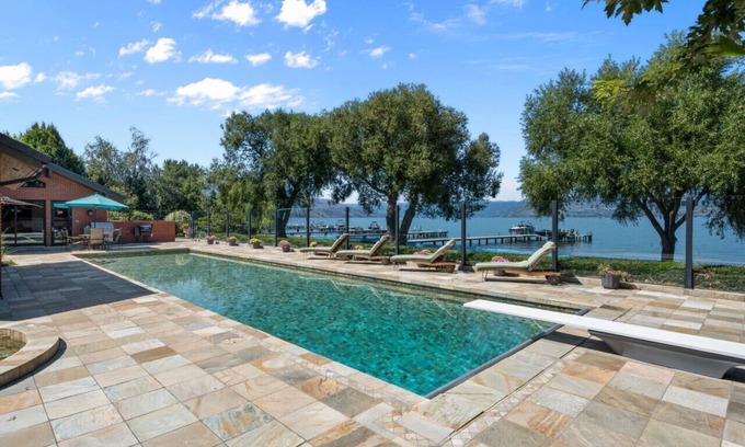 The centerpiece of this magnificent property is its heated pool, offering a luxurious swimming experience with stunning lake views. The pool area, complemented by a private dock and an exclusive boatlift capable of handling a 10,000lb boat, creates a perfect blend of relaxation and aquatic adventure. Guests can enjoy the serene lakefront atmosphere or embark on boating escapades right from their backyard.